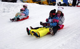 2月2日(日)午前7時30分から朝食、8時30分に出発、昨日と同じ「舞子スノーリゾート」へ。“マイ雪原”で、早速そり滑り。雪が固くしまっていて、かなりのスピ
