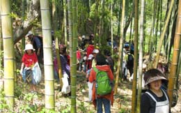 途中、川沿いにあるホームセンターの駐車場でオリエンテーションを行う。注意事項の説明、準備体操、自己紹介、参加者の心得唱和を行い再度出発。一時間程歩いた後、目的地の竹林に到着。