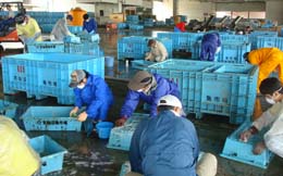 ク、保護めがね、帽子のスタイルで活動開始。カツオを入れる青いケースが、津波で海に流されて回収された物が、重油等でかなり汚れていましたが、洗剤・たわし・スポンジ等で悪戦苦闘しました。午前中は、それほどでもなかったのですが、午後になると多少疲れが出てきましたが、皆さんあまり言葉も発せず黙々と作業に取組みました。ケースは、かなりの数で、後を振返るとまだ洗浄されていないケースが山高く積まれていました。