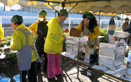 | 【朝から、風が吹いている施設の庭で、全員で120人分の豚汁作り。子供達食べてくれるかな。】 | ||
